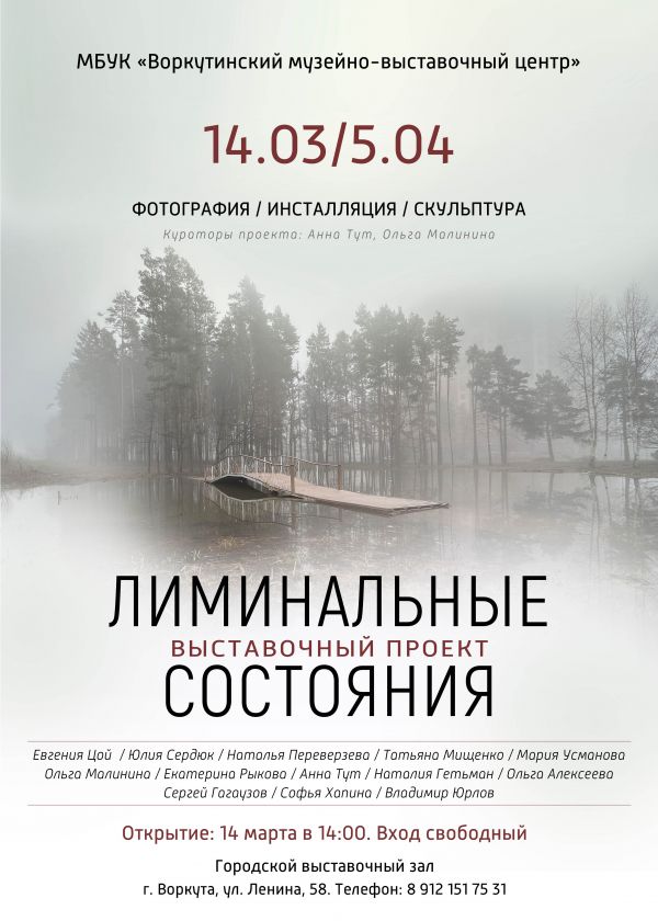 С 14 марта по 05 апреля 2024 года в Городском выставочном зале Воркутинского музейно-выставочного центра пройдет групповая выставка современных фотографов и художников из разных городов России от Уссурийска до Санкт-Петербурга «Лиминальные состояния».