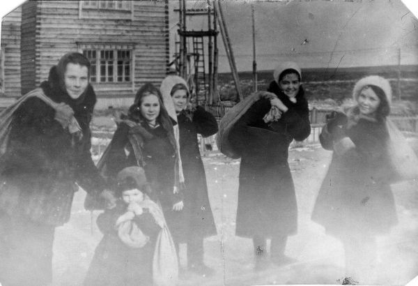 Женщины и дети, собирающие бутылки для фронта., п. Воркута, 1940-е годы. Фото из фондов ВМВЦ