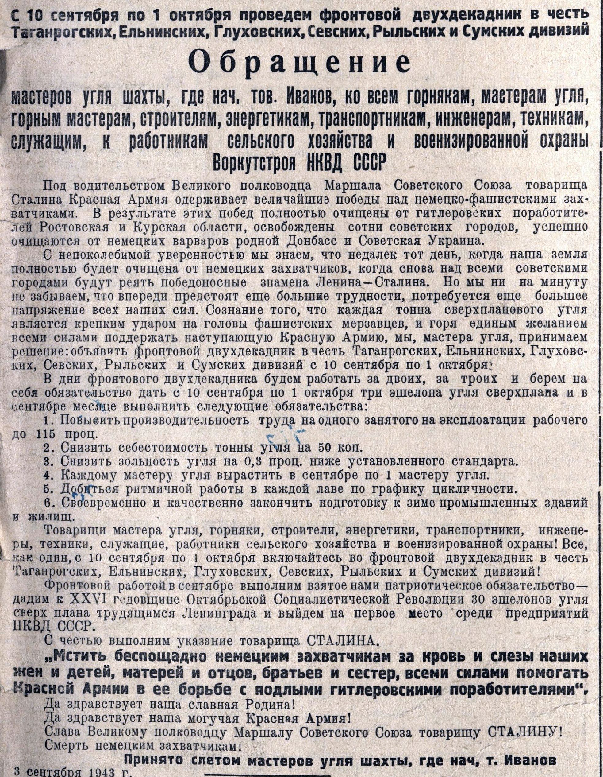 В шахтерской Воркуте с болью узнали об оккупации Донбасса. А успех Красной Армии по освобождению шахтёрских городов отметили фронтовым двухдекадником и рекордными производственными показателями.
