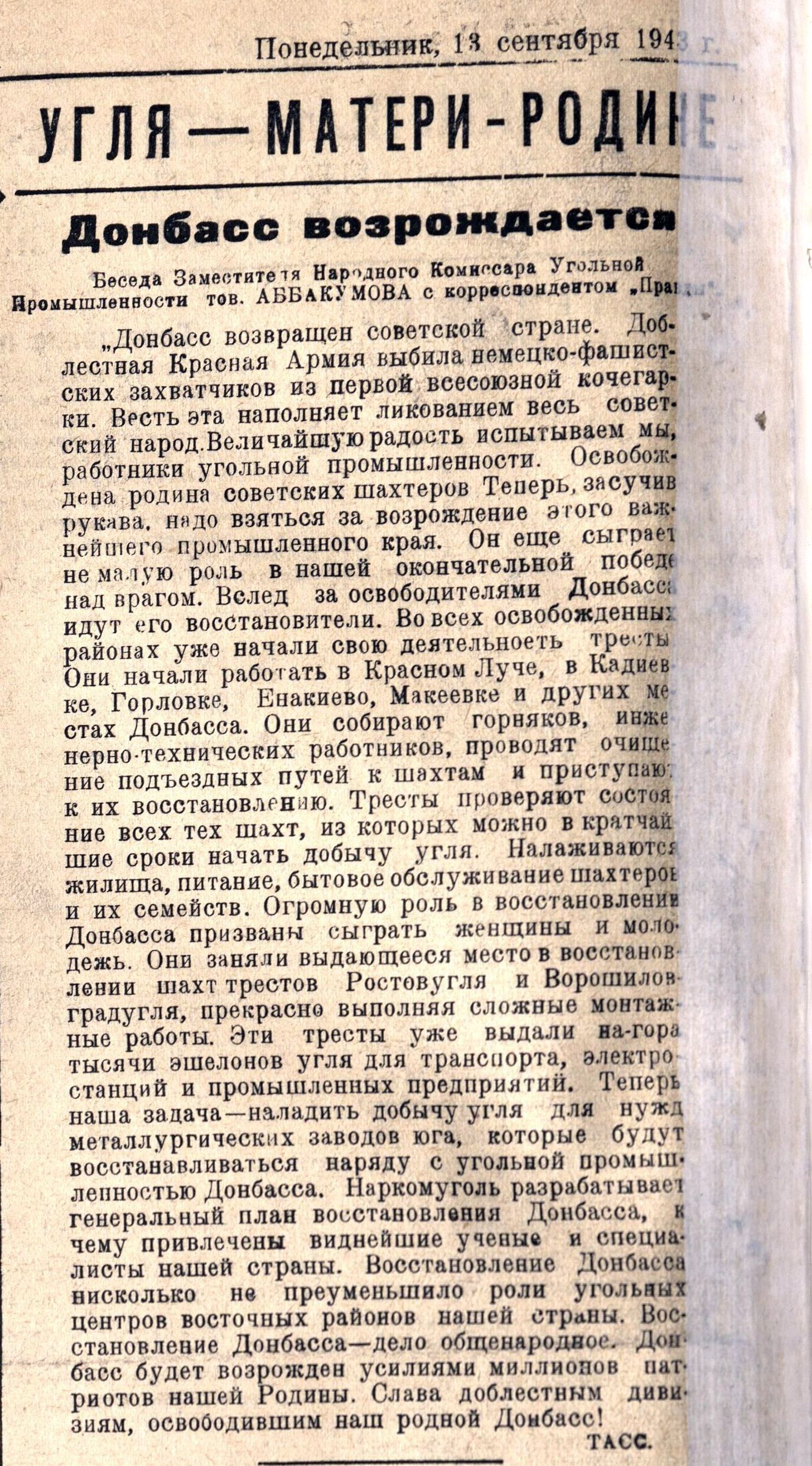 В Воркуте внимательно следили за судьбой Донецкого бассейна еще и потому, что работать в Заполярье в военное время оставались сотни шахтеров из городов Донбасса, Ворошилов градской и Ростовской областей. Уже 13 мая 1943 года «Заполярная кочегарка» поместила статью газеты «Правда», которая начиналась словами «Донбасс возвращен советской стране».