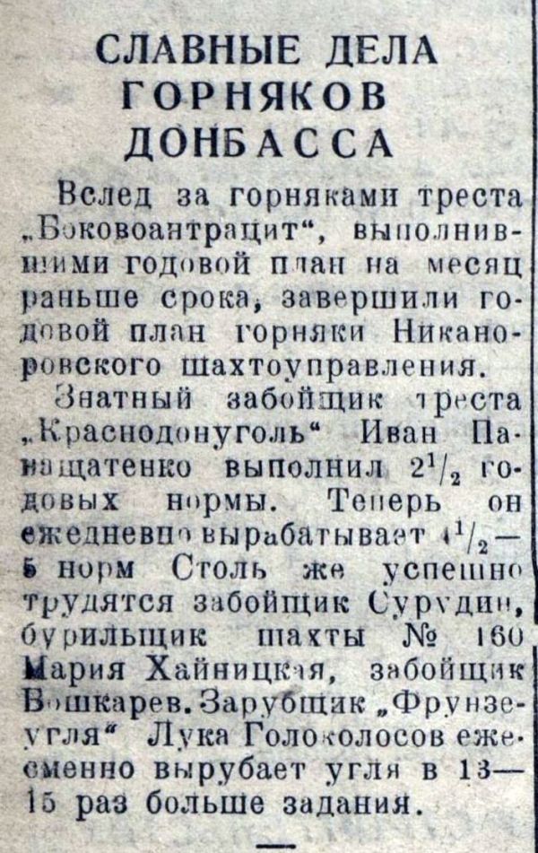 По мере восстановления главной угольной сокровищницы страны - Донецкого угольного бассейна – отдельные шахты и крупные объединения включались во Всесоюзное социалистическое соревнование, чтобы внести свою лепту в победу над фашистами.