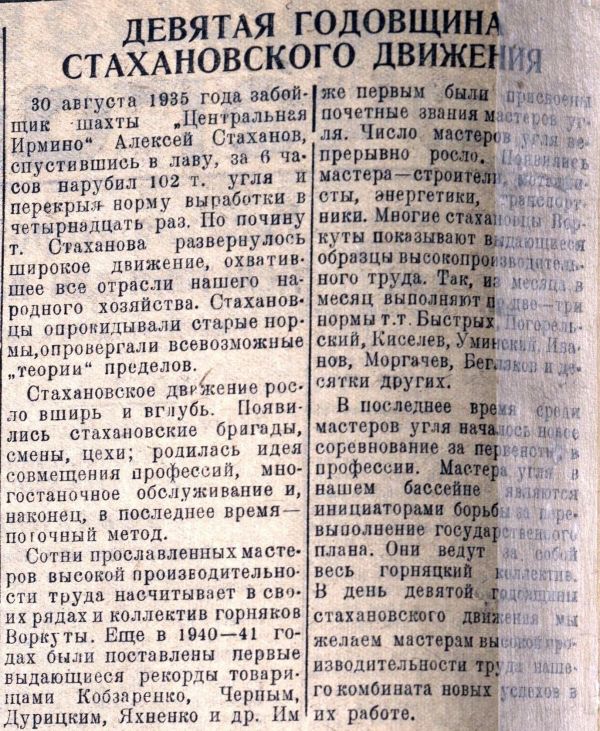 Все угольные регионы Советского Союза за основу своей работы взяли трудовой подвиг Алексея Стаханова. Стахановское движение из угольной распространилось во все сферы народного хозяйства. В Воркуте тоже появлялись стахановские бригады и участки, причем, не только в угольной отрасли.