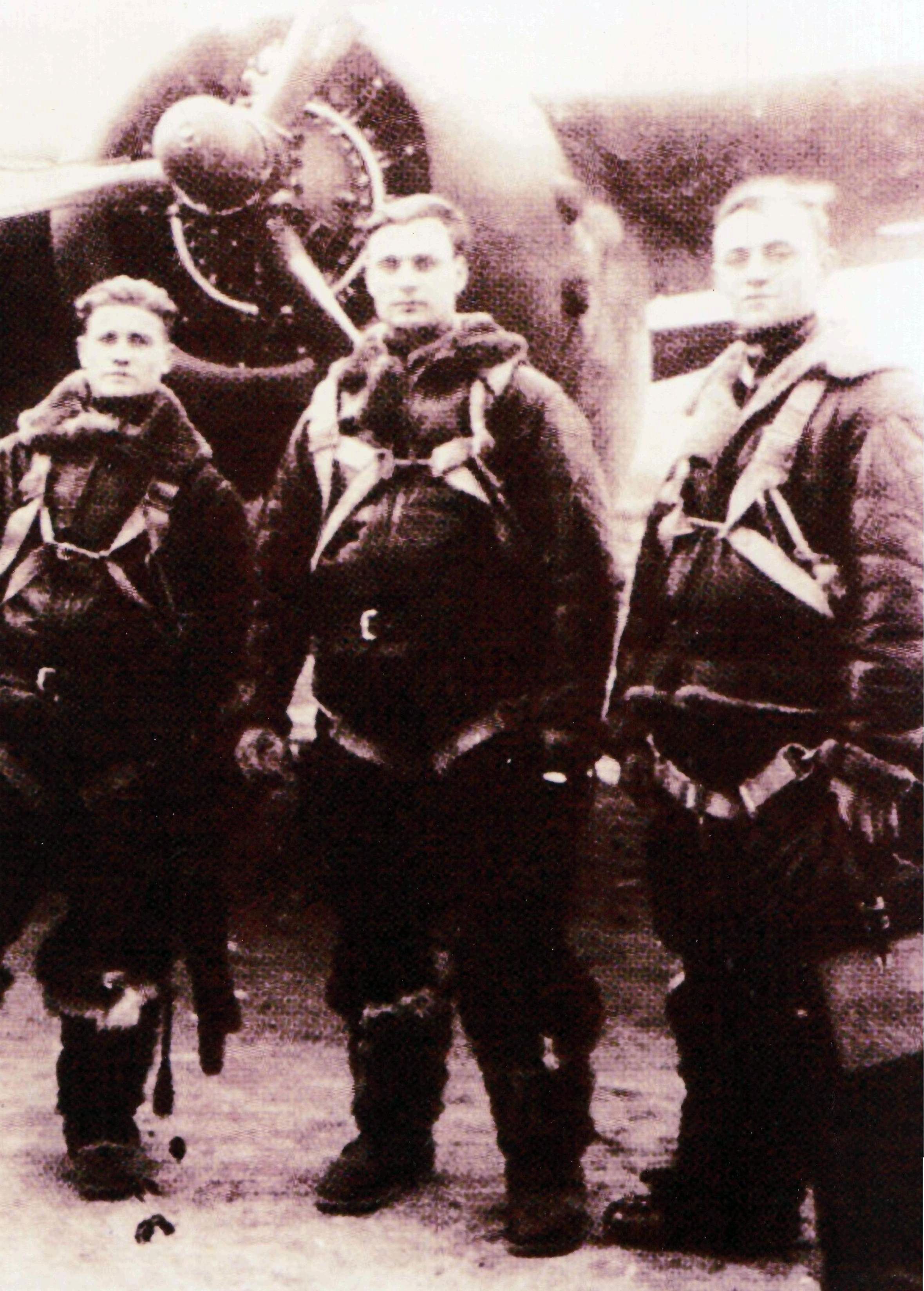 Командир 108-й отдельной разведывательной авиационной эскадрильи Василий Дончук с членами своего экипажа - штурманом Николаем Абрамовым (слева) и стрелком-радистом Василием Кожуховым (справа), осень 1944 года, Мурманская область, аэродром поселка Африканда