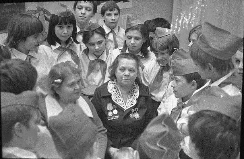 Пионеры школы №16 на встрече с ветераном Воркуты Жибковым И.Г., ноябрь 1973 года,