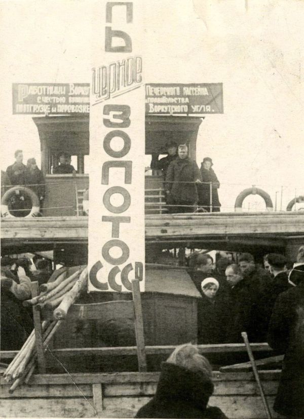 Митинг на пристани Воркута-Вом в день отправки первого каравана с углем, июнь 1941 года
