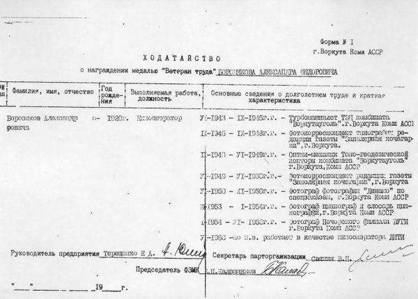Копия ходатайства о награждении А.Ф. Боровикова медалью «Ветеран труда» из фонда МБУ «Воркутинский муниципальный архив»