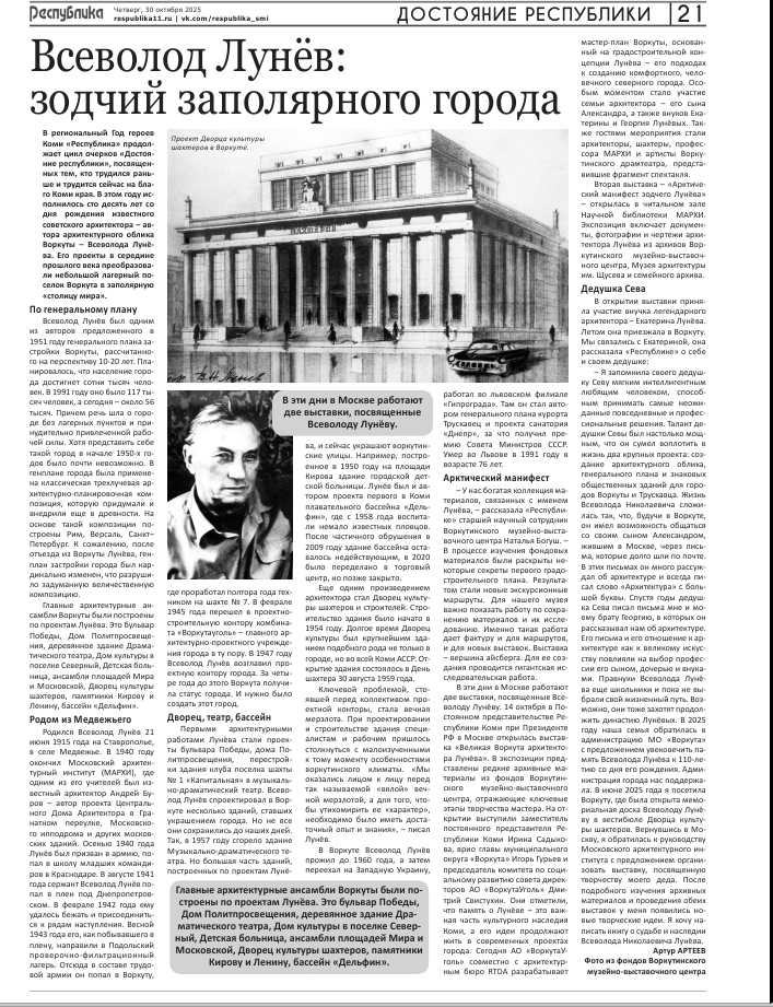 В региональный Год героев Коми «Республика» продолжает цикл очерков «Достояние республики», посвященных тем, кто трудился раньше и трудится сейчас на благо Коми края. В этом году исполнилось сто десять лет со дня рождения известного советского архитектора – автора архитектурного облика Воркуты – Всеволода Лунёва. Его проекты в середине прошлого века преобразовали небольшой лагерный поселок Воркута в заполярную «столицу мира».