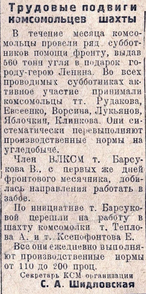 …Поместили их в землянке. Три долгих года прожила семья Барсуковых из шести человек в этой землянке, пока им не предоставили небольшую комнатку. Ванда работала чертежницей. Но она была недовольна этой работой. Ей казалось, что она приносит мало пользы Родине, фронту. И вот тогда девятнадцатилетняя комсомолка идет в забой навалоотбойщиком на один из участков шахты…