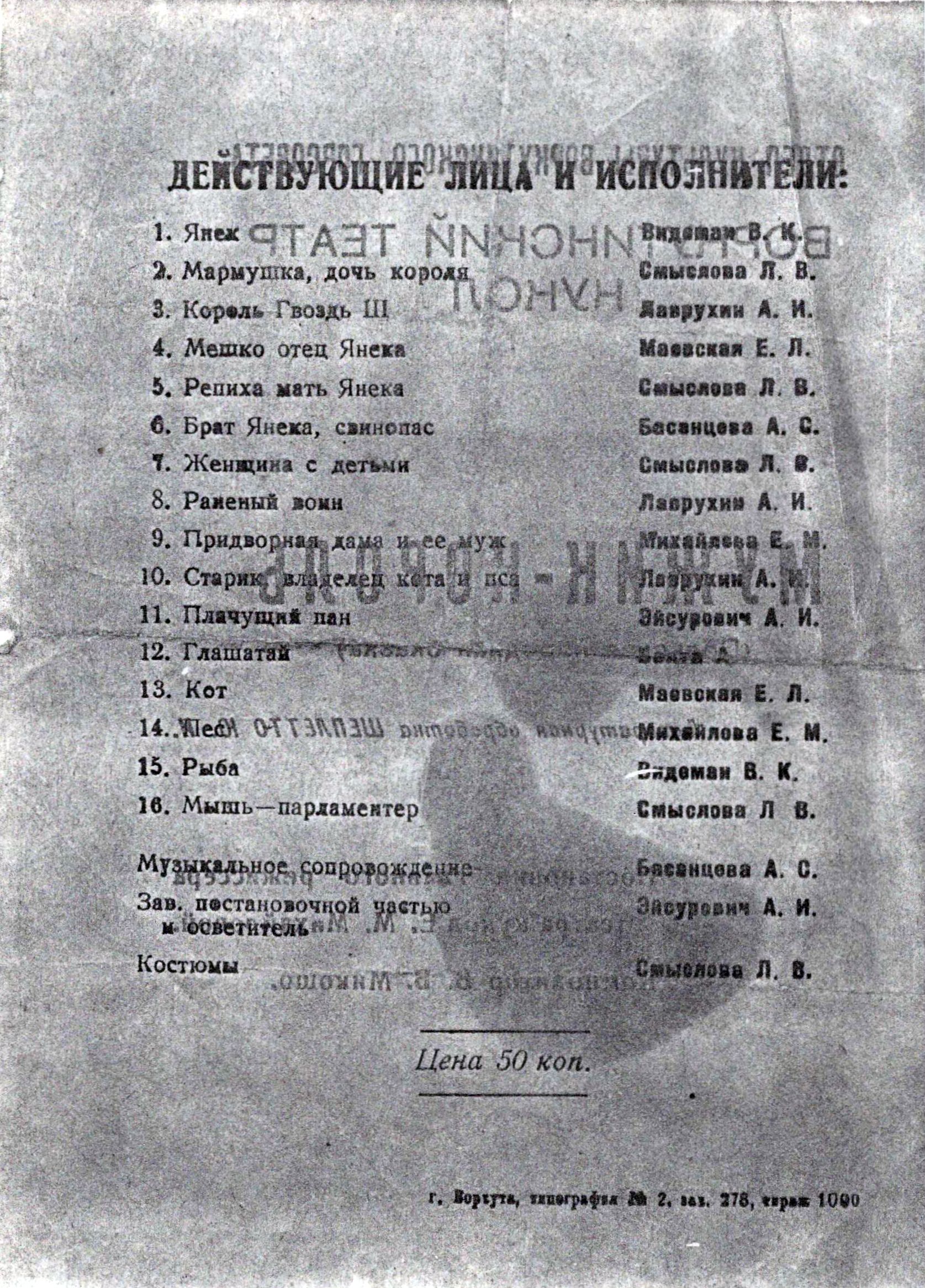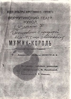 В запасниках научно-вспомогательного фонда воркутинского музейно-выставочного центра хранится свидетельство еще одной постановки 1955 года: копия программки спектакля «Мужик - король», поставленного по мотивам польской народной сказки главным режиссером театра кукол Е.М. Михайловой. Точная дата премьеры – 25 июня 1955 года – указана в автографе. Надпись адресована режиссёром Михайловой товарищу Шеплетто: Юрий Иванович был автором литературной обработки сказки.
