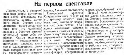 Премьера «Аленького цветочка» кукольного стала следующей вехой в истории театра. 2 марта 1955 года газета «Заполярье» поместила заметку «На первом спектакле» с описанием реакции юных зрителей и оценкой работы коллектива: «Хорошо выполнены художником Матвеевым декорации, искусно сделаны сами куклы. Можно отметить и талантливую игру актеров Михайловой и Куликова».