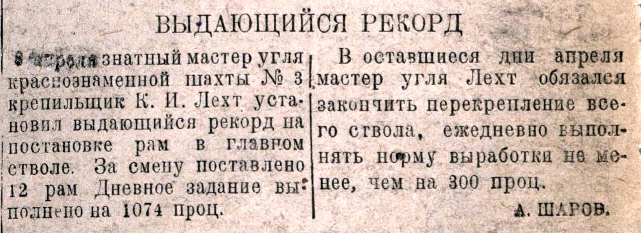А 30 апреля 1944 года свой новый апрельский рекорд установил мастера угля К. Лехт: крепильщик шахты №3 за 8 часов выполнил сменное задание на 1250 процентов.
