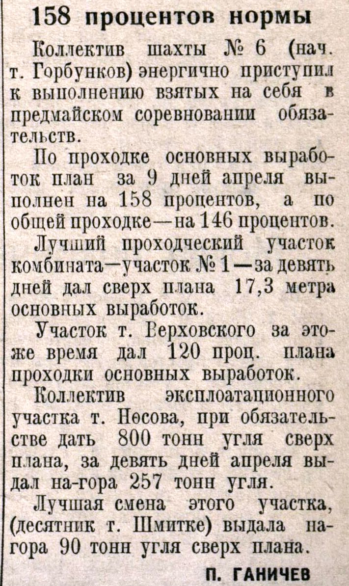 На 158 процентов плановое задание по проходке выполнил коллектив шахты №6 за первые 9 дней апреля, о чем газета «Заполярная кочегарка» написала 11 апреля 1945 года.