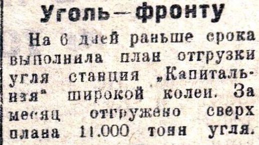 Еще несколько высоких результатов воркутинцы показали в последние, завершающие дни предмайского соревнования. 24 апреля 1944 года – на 6 дней раньше срока - план по отгрузке угля выполнила станция «Капитальная» широкой колеи. А всего в апреле здесь было отгружено 11000 тонн угля сверх плана.