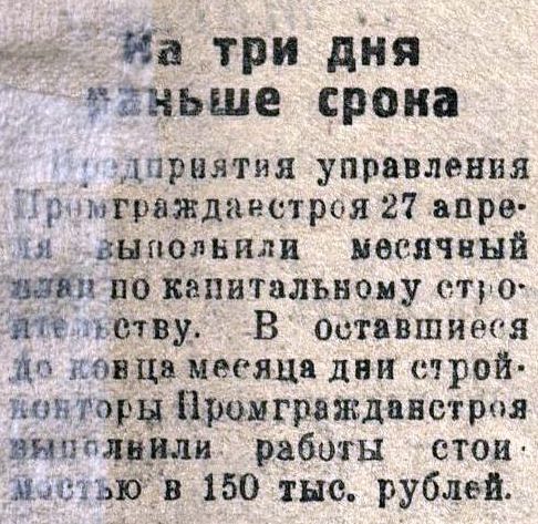 27 апреля 1944 года месячный план месяца по капитальному строительству завершили предприятия управления Промгражданстрой, а за оставшиеся дни апреля строители выполнили сверх плана работ на 150 тысяч рублей.