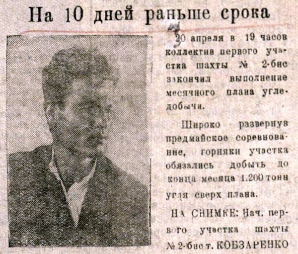 О новых достижениях по итогам 20 дней трудовой вахты предмайского соревнования газета «Заполярная кочегарка» писала 22 апреля 1944 года, в день рождения вождя пролетариата В.И. Ленина: 2 938 тонн угля сверх плана добыли горняки «Капитальной», еще 572 тонны сверхпланового угля за две декады дала шахта № 2-бис, а два ее участка досрочно завершили план месяца, причем, горняки участка Кобзаренко до конца месяца обязались добыть еще 1200 тонн сверх плана.