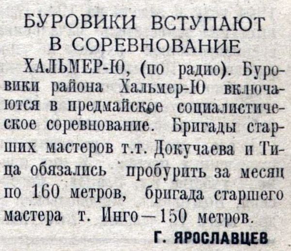 4 апреля 1945 года газета «Заполярная кочегарка» опубликовала, переданные по радио, предмайские обязательства буровиков Хальмер-Юньского месторождения, которые обязались прорубить по 150 и 160 метров, а боец горноспасательной части Н. Жучков публично заявил о намерении в свободное от службы время работать навалоотбойщиком.
