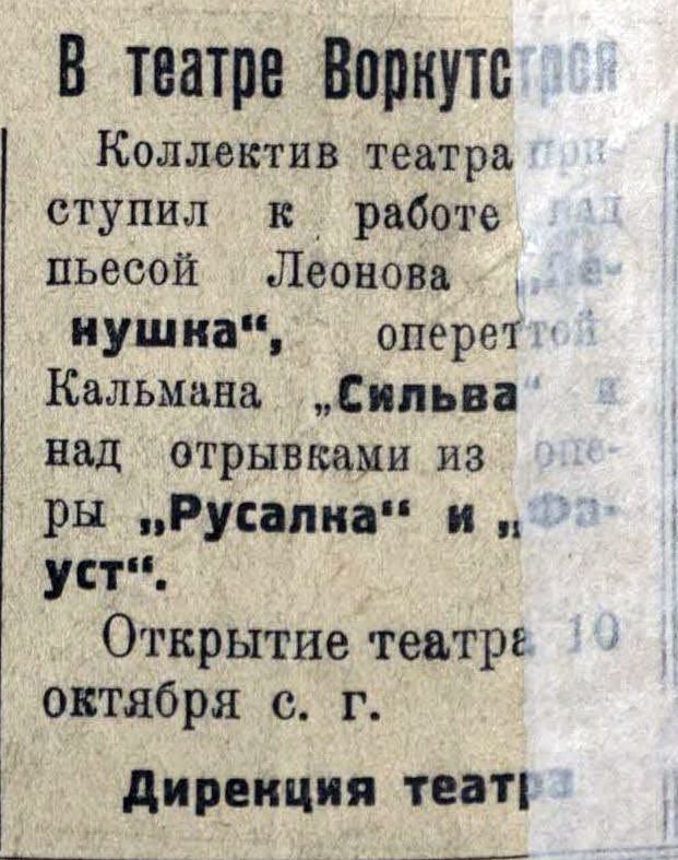 Чтобы поддержать трудовой порыв воркутинцев 8 августа 1943 года согласно приказу № 883 начальника Управления Воркутстроя НКВД СССР М. М. Мальцева «…в целях наилучшего систематического обслуживания населения Воркутинского угольного бассейна художественно-зрелищными мероприятиями» был образован музыкально-драматический театр Воркутстроя НКВД. Его труппа состояла из 21 человека, как заключенных (Б. С. Дейнека, Д. А. Козин, В. К. Владимирский и др.), так и «вольнонаемных» (Н. И. Глебова, В. М. Пясковская, А. П. Пилацкая и др.). Художественным руководителем театра стал бывший главный режиссер Большого театра Б. А. Мордвинов. Открытие театра назначили на 1 октября 1943 г.