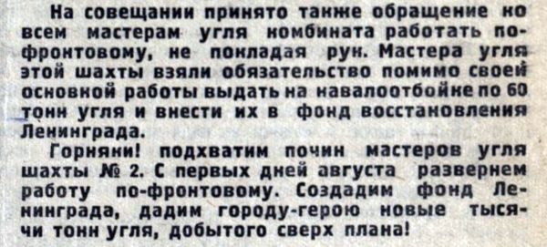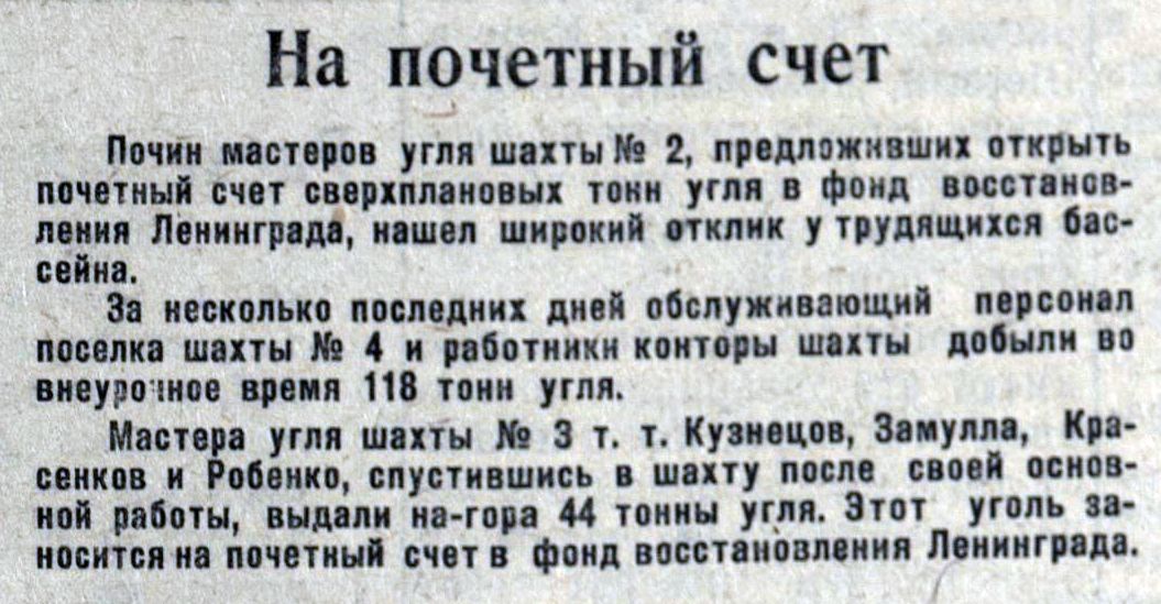 Передовые предприятия активно рапортовали о пополнении почетного счета сверхпланового угля добытого для восстановления города Ленинграда.