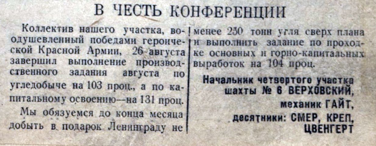 Сначала горняки коммунисты, передовики и мастера угля, а вслед за ними многие трудовые коллективы брали на себя обязательства встретить партконференцию особыми высокими трудовыми достижениями. Так, например, 4 августа 1944 года газета «Заполярная кочегарка» сообщила о решении мастеров угля шахты №2 с первых дней августа взяли на себя особые повышенные обязательства по добыче угля в фонд восстановления города Ленинграда.