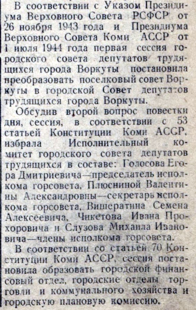 В этот же день, 16 августа 1944 года состоялась первая сессия Воркутинского городского Совета депутатов трудящихся. Первым председателем исполкома горсовета был избран Е. Д. Голосов, бывший фронтовик, демобилизованный из армии по ранению, который ранее работал первым секретарем Сысольского райкома ВКП(б). Сессия стала итогом преобразования рабочего поселка Воркута город республиканского подчинения. К этому времени производственные мощности Воркуты увеличились в 6 раз по сравнению с довоенным уровнем. Продолжая формирования органов исполнительной власти молодого города, сессия приняла ряд организационных решений.