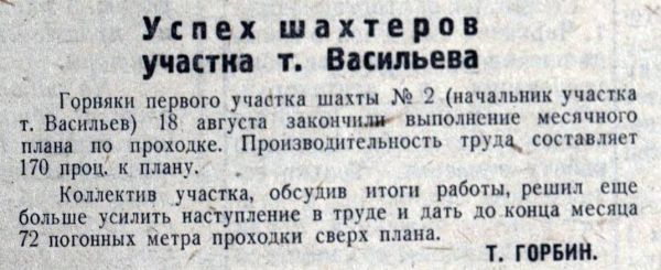 23 августа план месяца выполнил участок № 2 четвертой шахты.