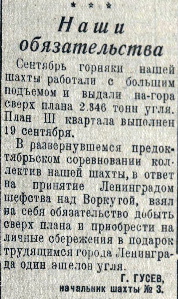 Газета «Заполярная кочегарка» много писала о последователях передовика Погорельского. Одновременно с новой инициативой в предоктябрьском соревновании выступили горняки шахты № 3, которые уже к 3 октября выполнили плановое задание 10 месяцев.