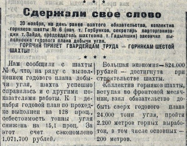 О буднях трудового фронта красноречиво говорили портреты передовиков – орденоносцев Баба-Мурат Давлят Оглы и Кадира Набиевича Гильманшина, Ивана Прохоровича Чикетова, и Болеслава Игнатовича Гурского, Ивана Александровича Дурицкого и Семена Алексеевича Вишератина. Газета писала о новых достижениях крепильщика Василия Антоновича Хобина и его товарищей, о самоотверженном порыве юной комсомолки Ванды Барсуковой.