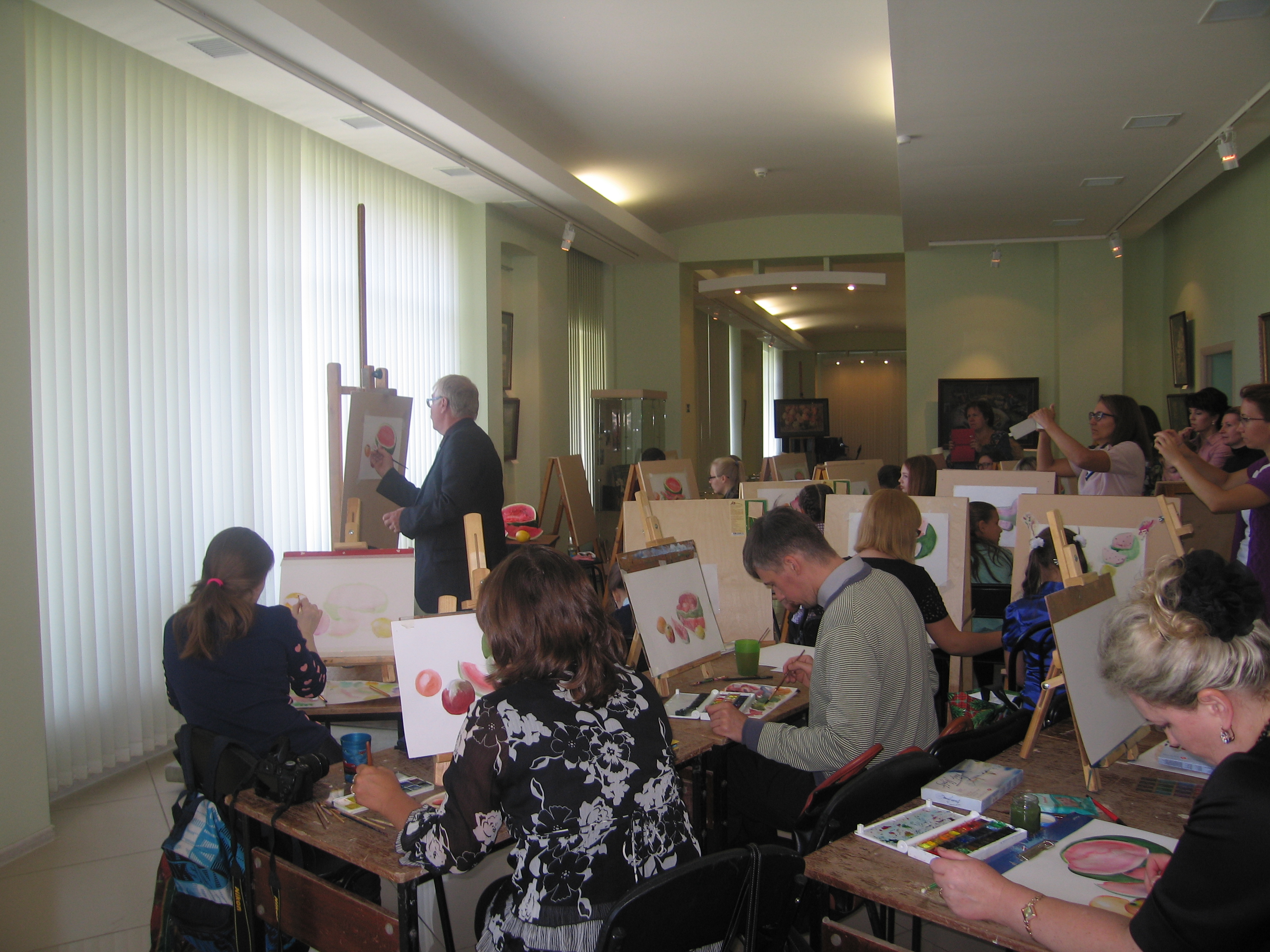 В субботу, 3 сентября в Городском выставочном зале состоялся мастер-класс в рамках выставочного проекта Академии акварели и изящных искусств Сергея Андрияки (г. Москва). Мастер-класс провел художник, специалист выставочного отдела академии, преподаватель Смирнов Юрий Владимирович.